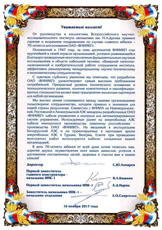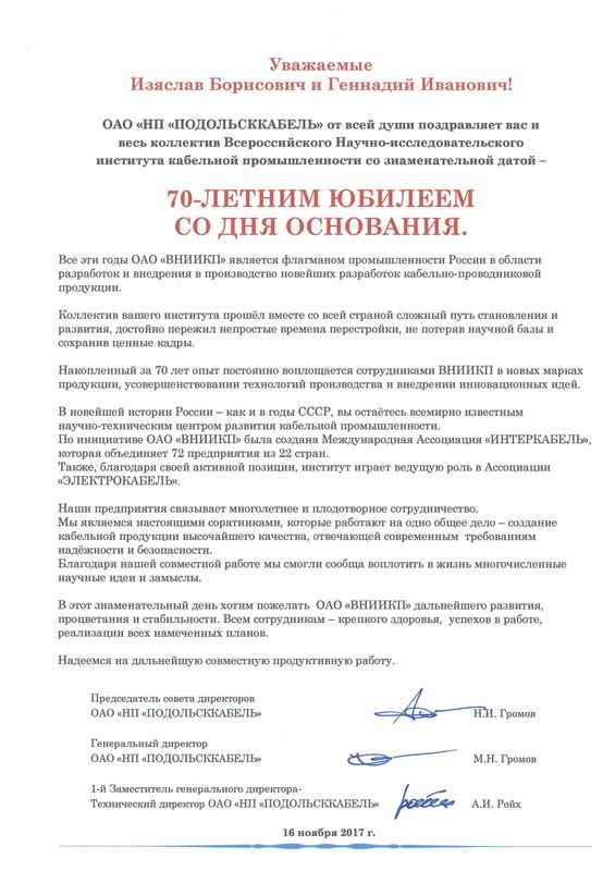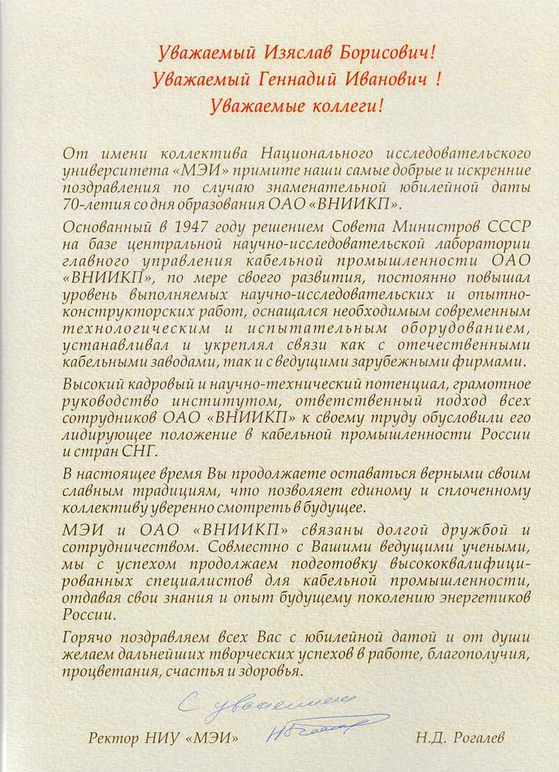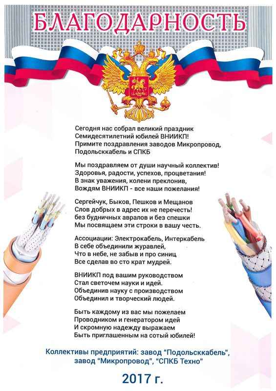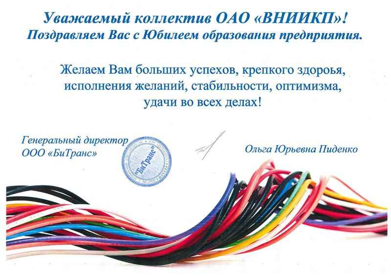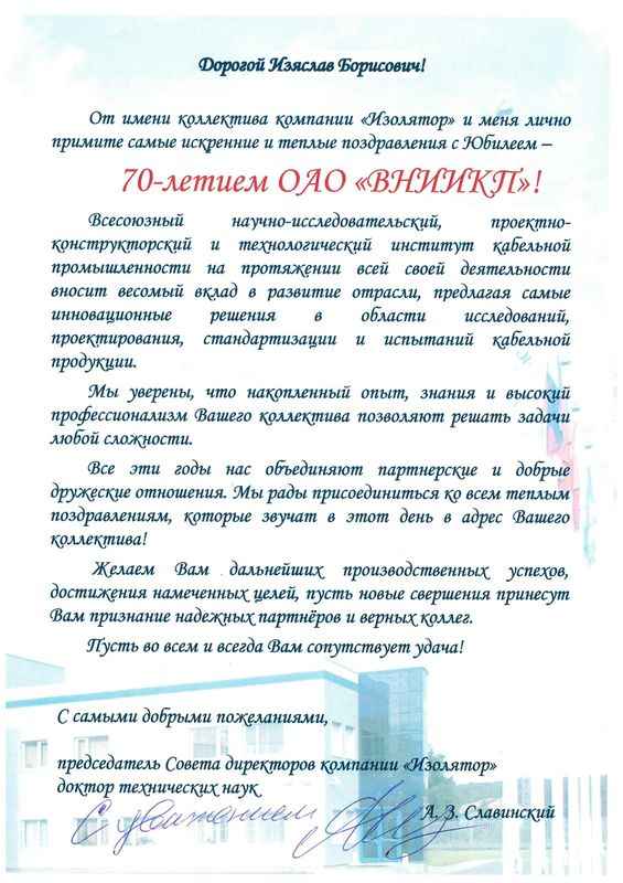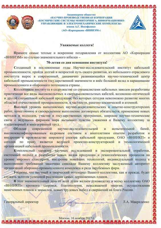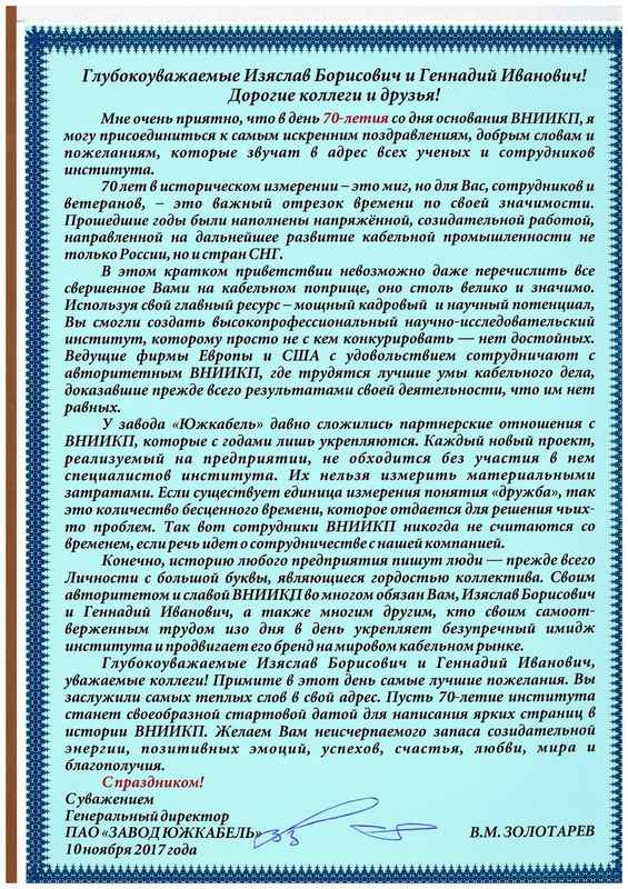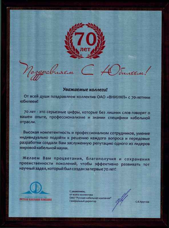 От всей души поздравляю Вас (и себя) с Юбилеем родного института. Желаю всем нам крепкого здоровья, оптимизма, научных и финансовых достижений. Наш ВНИИКП прошёл долгий путь, отмеченный многочисленными успехами, которыми мы по праву гордимся. В то время, когда многие научно-исследовательские отраслевые институты, к глубокому сожалению, прекратили своё существование, мы как организация, не только выжили, но по многим позициям развились, укрепили свой потенциал, и поэтому с уверенностью смотрим в будущее. Зав. отделением №2 «Кабели, провода и арматура для систем коммуникации и информатизации» Овчинникова Ирина Александровна Зав. отделением №2 «Кабели, провода и арматура для систем коммуникации и информатизации» Овчинникова Ирина АлександровнаЖелаю уважаемым коллегам космических достижений, неиссякаемой энергии, надежной связи подразделений и сверхпроводящей удачи! Подробнее Зав. отделением №3 «Провода и кабели для электрических машин, установок транспорта и приборов» Новиков Дмитрий Владимирович Зав. отделением №3 «Провода и кабели для электрических машин, установок транспорта и приборов» Новиков Дмитрий ВладимировичДорогие коллеги! От лица коллектива Отделения №3 «Провода и кабели для электрических машин, установок транспорта и приборов» поздравляю вас с 70-и летием Института. Желаю интересных научных задач и успехов в работе. Подробнее Директор научного направления — Зав. отделением №4 «Сверхпроводящие и криорезистивные провода и технологии их производства» Виталий Сергеевич Высоцкий Директор научного направления — Зав. отделением №4 «Сверхпроводящие и криорезистивные провода и технологии их производства» Виталий Сергеевич ВысоцкийОтделение сверхпроводящих проводов и кабелей с огромным удовольствием поздравляет родной Институт и весь его коллектив с замечательным юбилеем! Мы с вами ровно пятьдесят лет и ни разу об этом не пожалели, наша жизнь в составе Института всегда была интересной и насыщенной! Желаем всем нам быть такими же энергичными, успешными и процветающими как в этот год семидесятилетнего юбилея! Надеемся так же все вместе с успехом встретить все грядущие юбилеи: 75… 80… 85… 150… и так далее… Подробнее