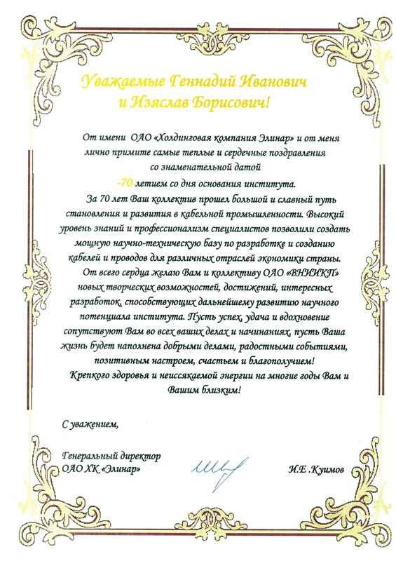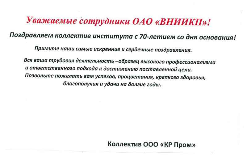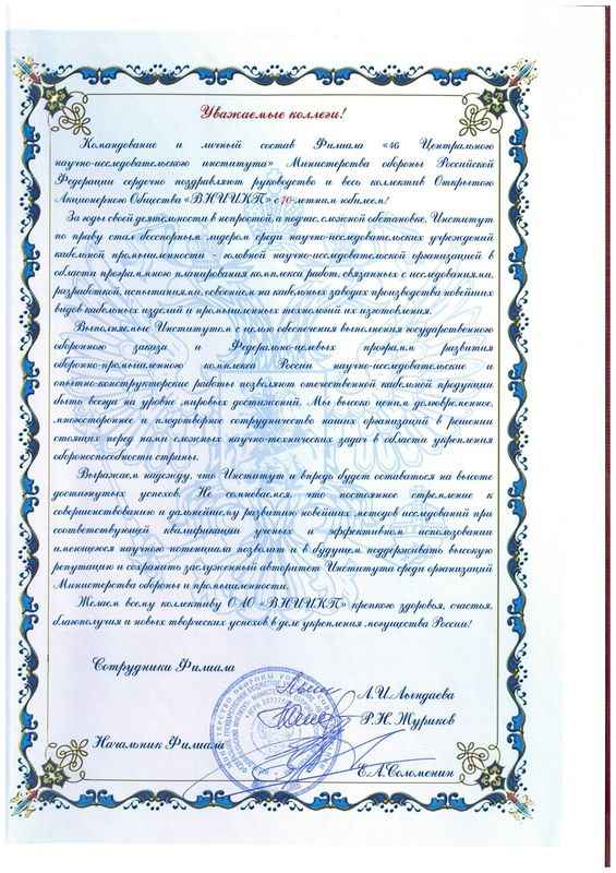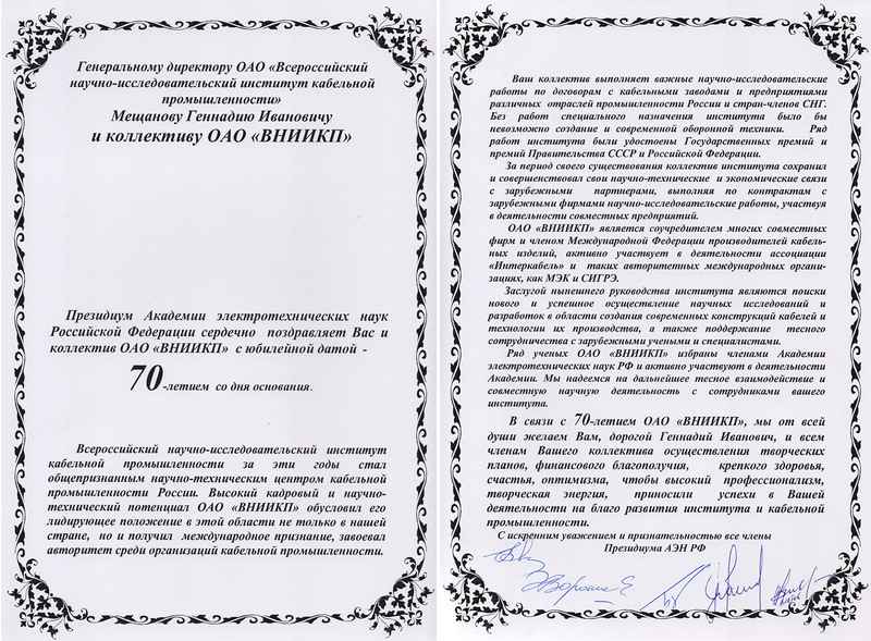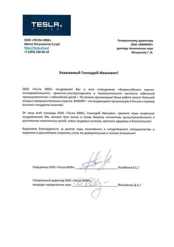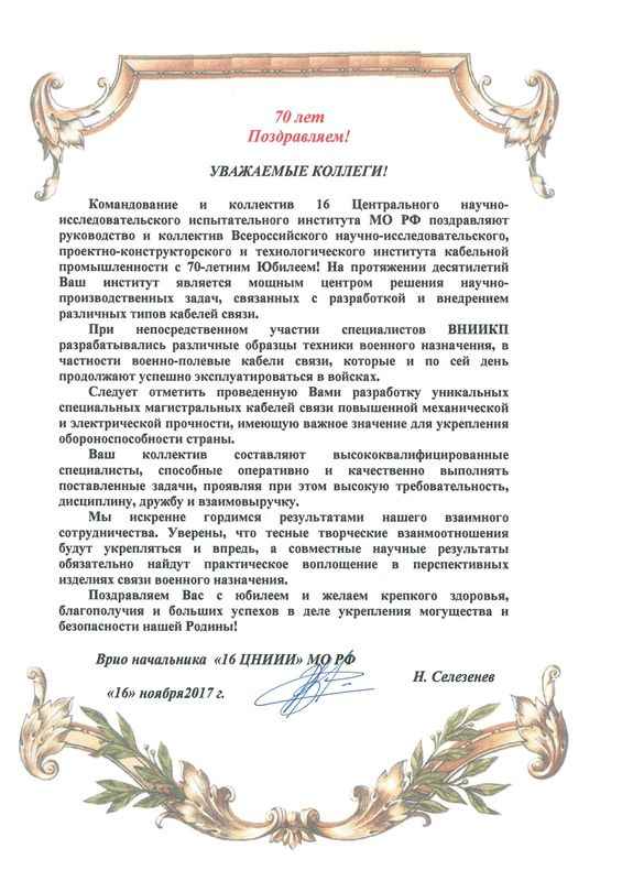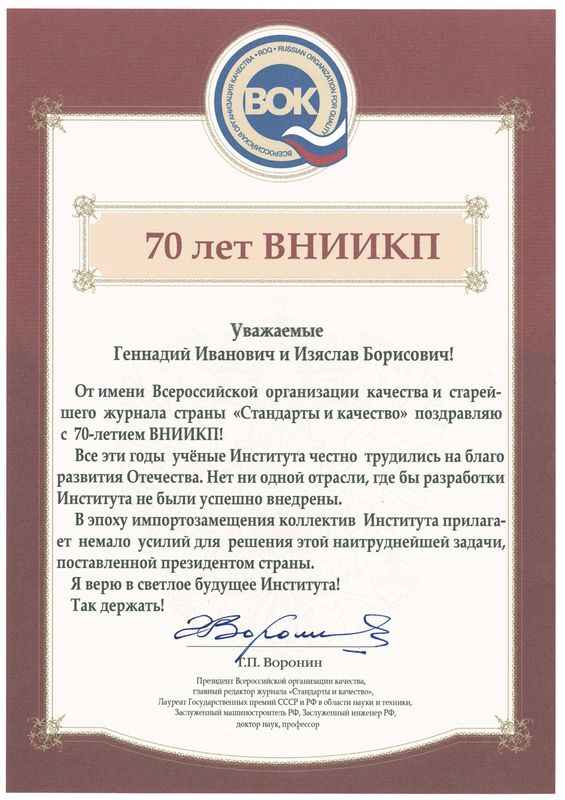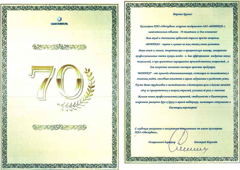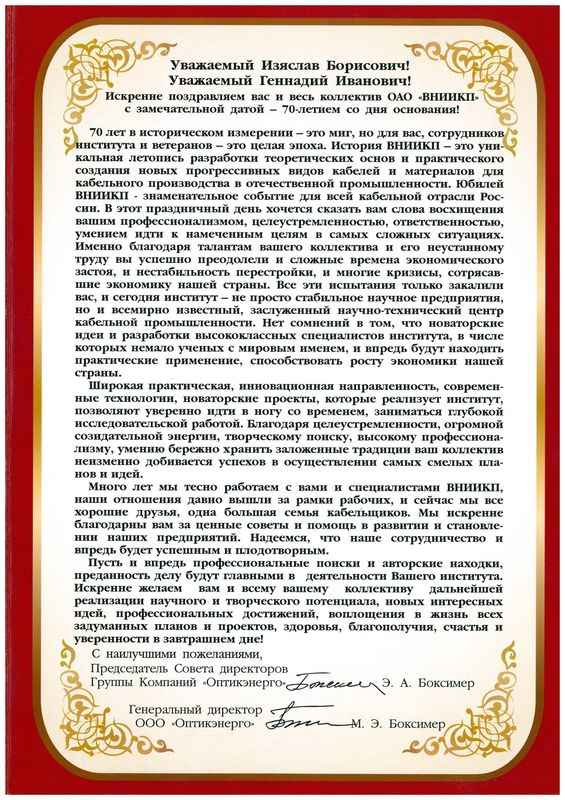 От всей души поздравляю Вас (и себя) с Юбилеем родного института. Желаю всем нам крепкого здоровья, оптимизма, научных и финансовых достижений. Наш ВНИИКП прошёл долгий путь, отмеченный многочисленными успехами, которыми мы по праву гордимся. В то время, когда многие научно-исследовательские отраслевые институты, к глубокому сожалению, прекратили своё существование, мы как организация, не только выжили, но по многим позициям развились, укрепили свой потенциал, и поэтому с уверенностью смотрим в будущее. Зав. отделением №2 «Кабели, провода и арматура для систем коммуникации и информатизации» Овчинникова Ирина Александровна Зав. отделением №2 «Кабели, провода и арматура для систем коммуникации и информатизации» Овчинникова Ирина АлександровнаЖелаю уважаемым коллегам космических достижений, неиссякаемой энергии, надежной связи подразделений и сверхпроводящей удачи! Подробнее Зав. отделением №3 «Провода и кабели для электрических машин, установок транспорта и приборов» Новиков Дмитрий Владимирович Зав. отделением №3 «Провода и кабели для электрических машин, установок транспорта и приборов» Новиков Дмитрий ВладимировичДорогие коллеги! От лица коллектива Отделения №3 «Провода и кабели для электрических машин, установок транспорта и приборов» поздравляю вас с 70-и летием Института. Желаю интересных научных задач и успехов в работе. Подробнее Директор научного направления — Зав. отделением №4 «Сверхпроводящие и криорезистивные провода и технологии их производства» Виталий Сергеевич Высоцкий Директор научного направления — Зав. отделением №4 «Сверхпроводящие и криорезистивные провода и технологии их производства» Виталий Сергеевич ВысоцкийОтделение сверхпроводящих проводов и кабелей с огромным удовольствием поздравляет родной Институт и весь его коллектив с замечательным юбилеем! Мы с вами ровно пятьдесят лет и ни разу об этом не пожалели, наша жизнь в составе Института всегда была интересной и насыщенной! Желаем всем нам быть такими же энергичными, успешными и процветающими как в этот год семидесятилетнего юбилея! Надеемся так же все вместе с успехом встретить все грядущие юбилеи: 75… 80… 85… 150… и так далее… Подробнее