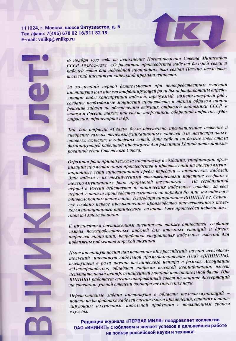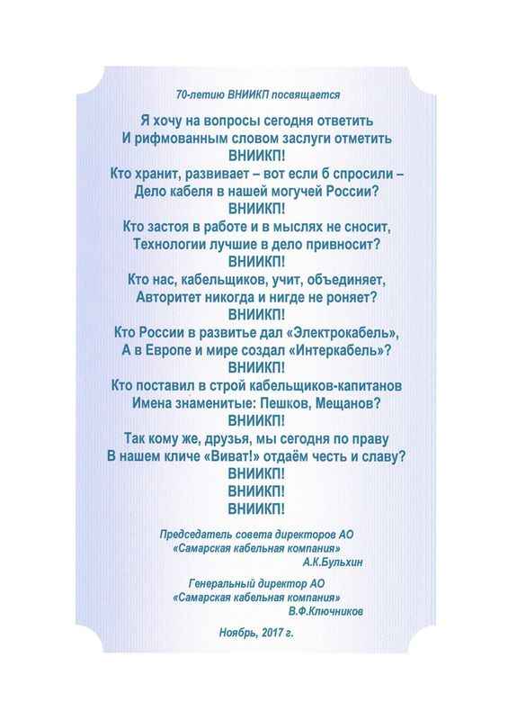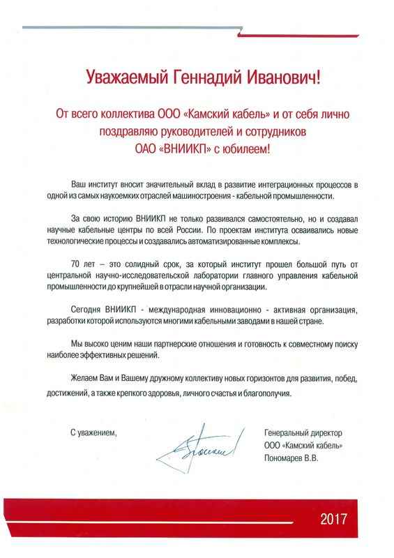 2017В настоящее время ОАО «ВНИИКП» - современный центр науки и техники кабельной промышленности, широко известный не только в странах СНГ, но и в мире. В институте продолжает функционировать аспирантура, созданная еще в 1950 году, действует ученый совет по защите кандидатских и докторских диссертаций. ОАО «ВНИИКП» - стабильный, сложившийся на протяжении многих лет коллектив инженеров и научных работников, в том числе высшей квалификации, имеющий в своем составе 9 докторов и 29 кандидатов наук, 8 из которых избраны действительными членами и членами - корреспондентами различных отраслевых академий наук Российской Федерации.