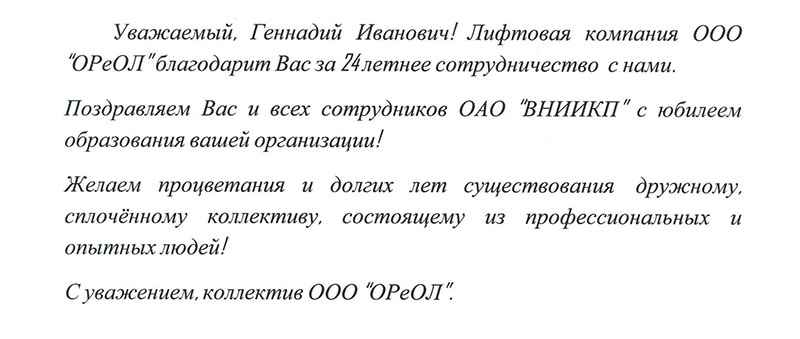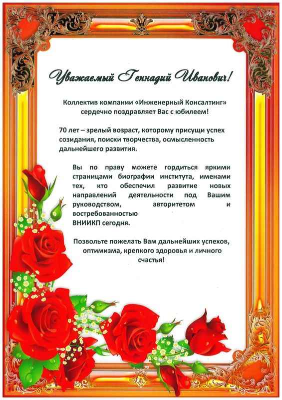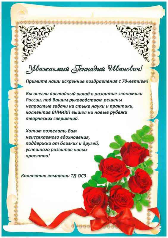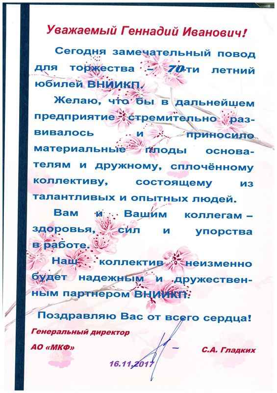 Зав. отделением №5 «Менеджмента качества, нормативно-технической документации и интеллектуальной собственности» Татьяна Сергеевна Мартыненко Зав. отделением №5 «Менеджмента качества, нормативно-технической документации и интеллектуальной собственности» Татьяна Сергеевна МартыненкоДорогие коллеги! Поздравляю коллектив с замечательным юбилеем. Желаю новых достижений, интересных проектов, роста нашего интеллектуального потенциала, внедрения в производство наших новейших разработок, динамичного развития и финансового благополучия. Заведующая отделением менеджмента качества, нормативно-технической документации и интеллектуальной собственности! Подробнее Зав. отделением работ в системе государственного оборонного заказа – начальник СКК Мосягин Александр Андреевич Зав. отделением работ в системе государственного оборонного заказа – начальник СКК Мосягин Александр АндреевичОт души поздравляю коллектив Института с юбилеем! Пусть эта значимая дата станет еще одним шагом вперед на пути освоения новых горизонтов, улучшения благосостояния, увеличения прибыли, исполнения всех задуманных планов и проектов. Желаем удачи и процветания! Подробнее